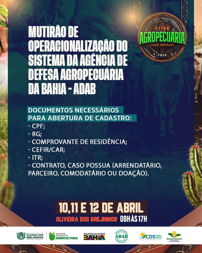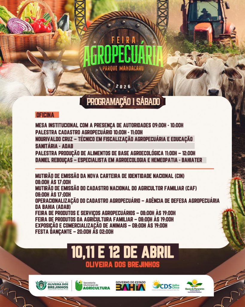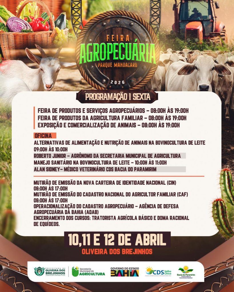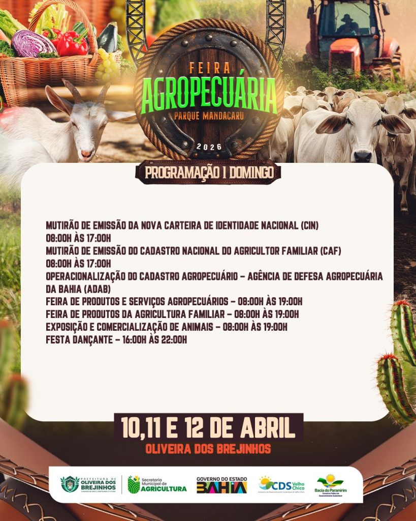 Entre os dias 10 e 12 de abril de 2026, o município de Oliveira dos Brejinhos (BA) se torna o epicentro do agronegócio e da agricultura familiar na região com a realização da Feira Agropecuária do Parque Mandacaru. O evento, sediado no Parque Mandacaru, próximo ao entroncamento Brejinhos X Boquira na BA-156, consolida-se como uma vitrine estratégica para o fortalecimento da economia local e o intercâmbio de conhecimento técnico.