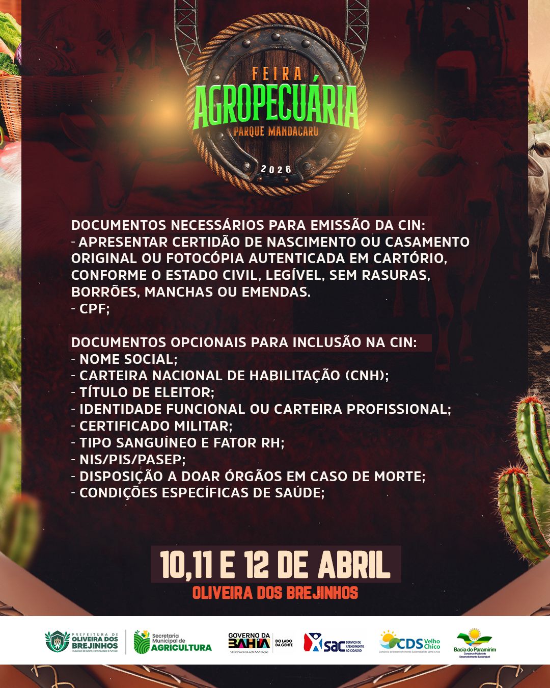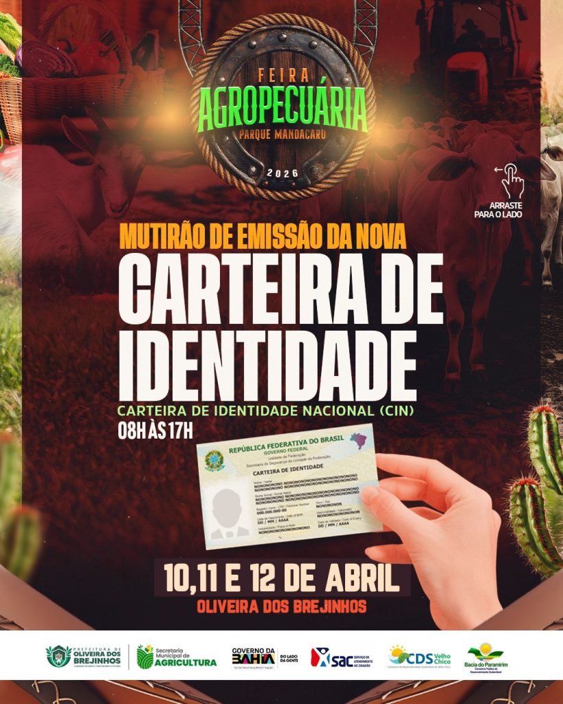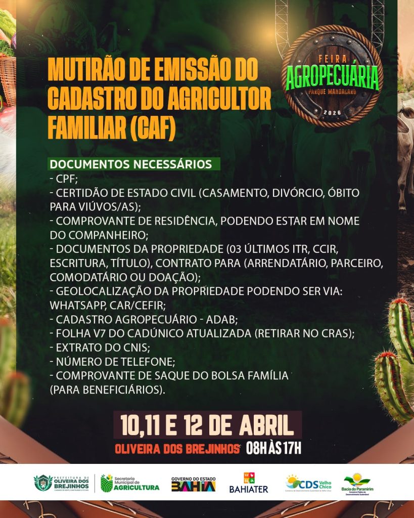 Entre os dias 10 e 12 de abril de 2026, o município de Oliveira dos Brejinhos (BA) se torna o epicentro do agronegócio e da agricultura familiar na região com a realização da Feira Agropecuária do Parque Mandacaru. O evento, sediado no Parque Mandacaru, próximo ao entroncamento Brejinhos X Boquira na BA-156, consolida-se como uma vitrine estratégica para o fortalecimento da economia local e o intercâmbio de conhecimento técnico.