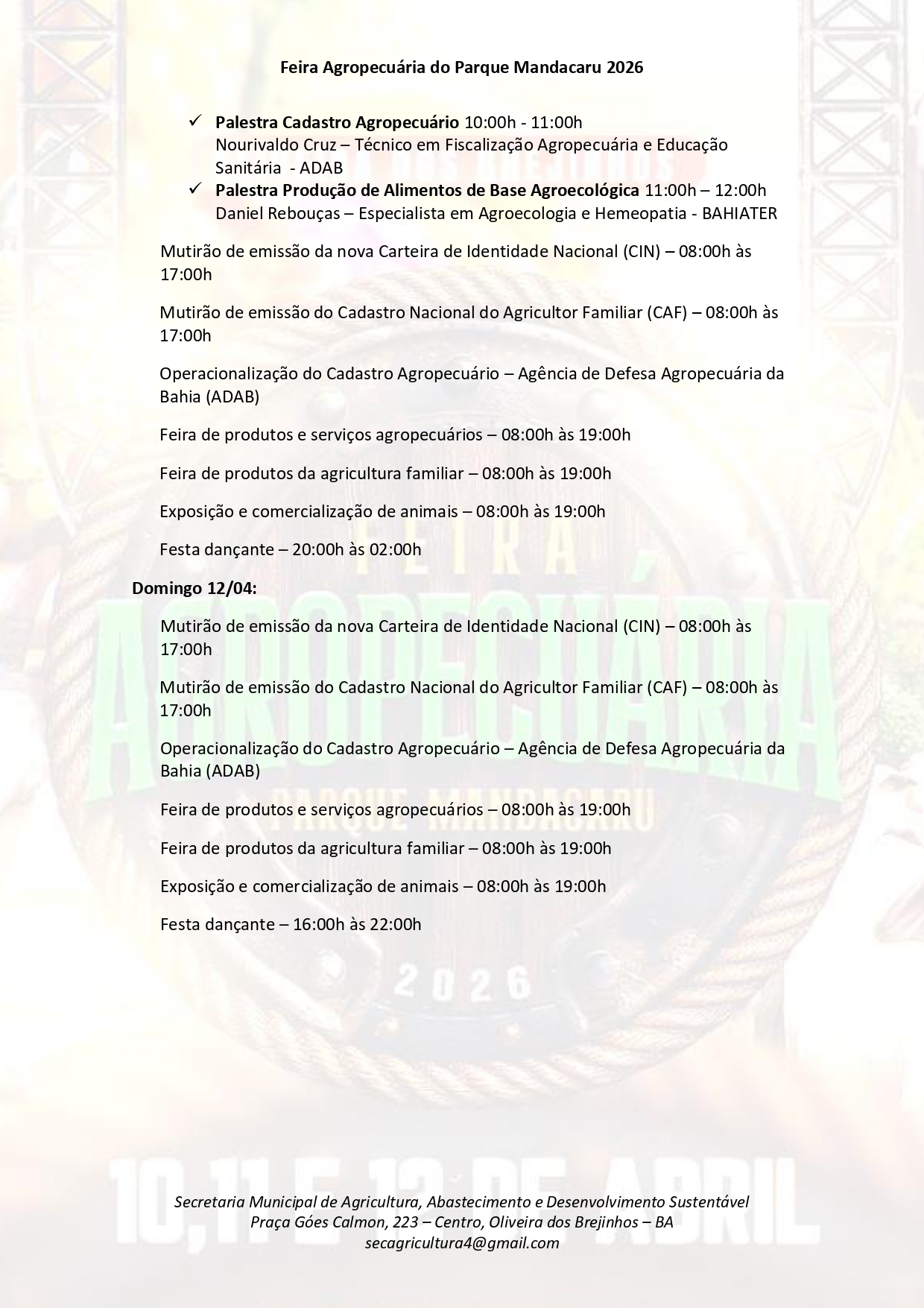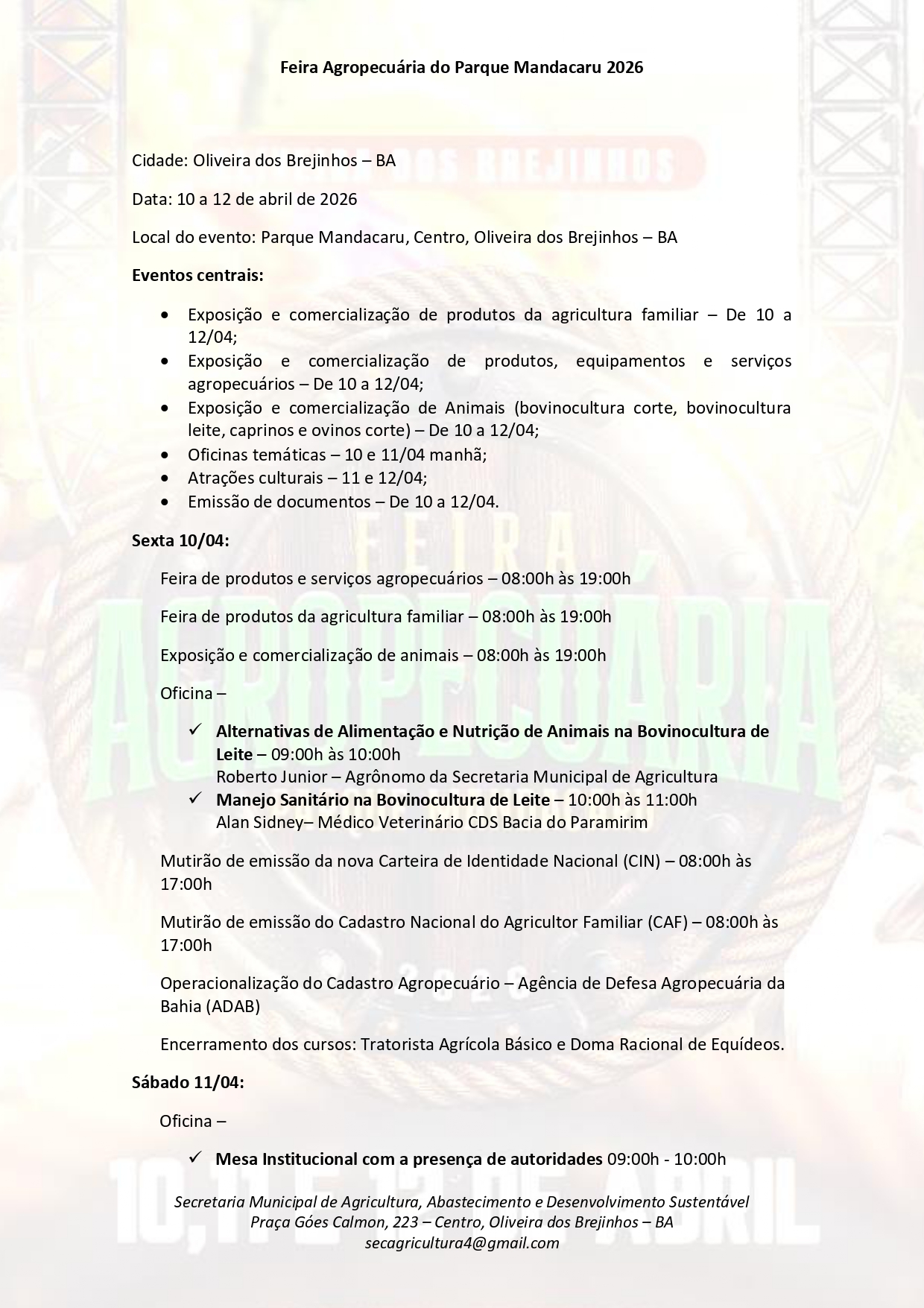 A Feira Agropecuária do Parque Mandacaru 2026 não é apenas um evento de calendário; é um investimento no futuro de Oliveira dos Brejinhos, gerando oportunidades, profissionalizando o campo e celebrando a força do povo baiano.